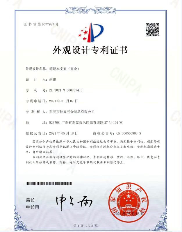 ◆ 專利權(quán): 擁有8項由國家知識產(chǎn)權(quán)局頒發(fā)的外觀設計專利證書
